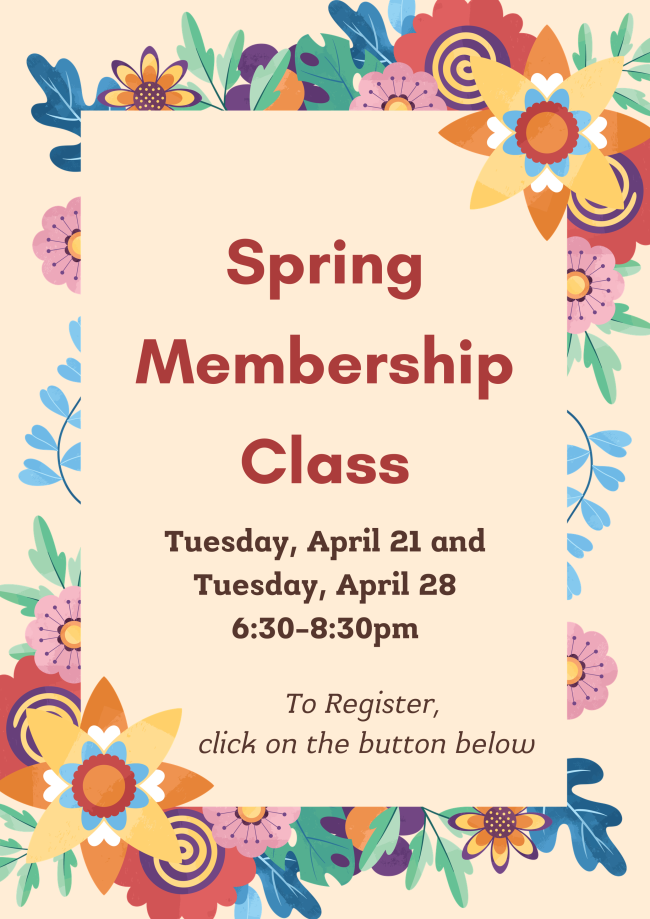 The Spring Membership Class will be in person on consecutive Tuesdays, April 21 and April 28, in the evening from 6:30 to 8:30pm. Registration is now open.