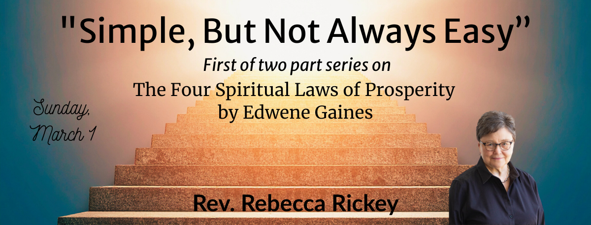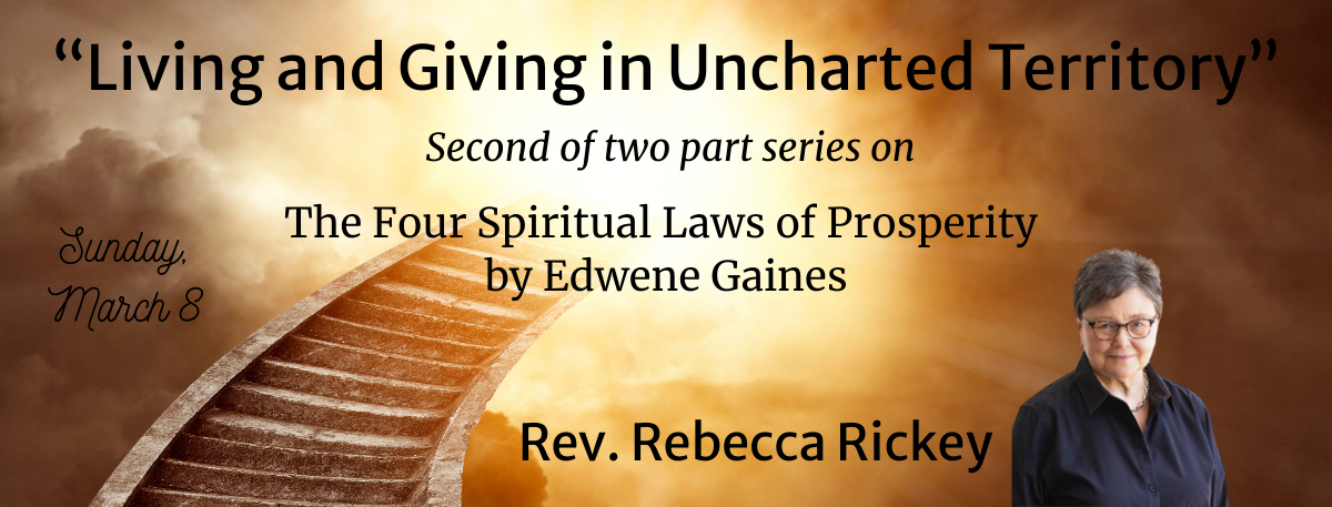 This week we will conclude our exploration of “The Four Spiritual Laws of Prosperity” by Edwene Gaines, and discuss her wisdom on tithing; including getting a handle on your money, what tithing is and what it isn’t and how that out-pictures in your life. And we will look at how to take what you know and what you have, move outside your comfort zone, and step into a life of abundance that you may not have dreamed possible. Join us!